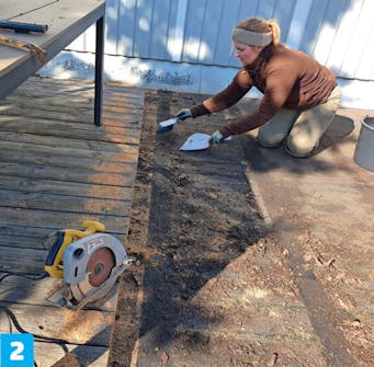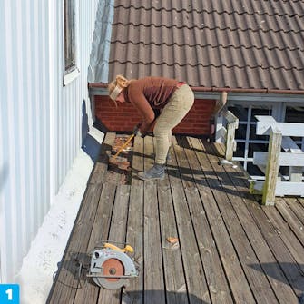 Hvis en gammel terrasse skal brækkes op, er det en fordel at skære det hele op i mindre bidder med rundsaven, inden du begynder at brække brædder op.