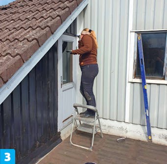 Lav alt det malerarbejde, du kan, med det samme, så du slipper for at dække terrassebrædderne af senere. Husk at bruge en stige med plastbeskyttere, eller læg en plade ud, så du ikke laver huller i tagpappet.