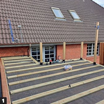 For at holde det færdige terrassedæk så lavt som muligt består underlaget af terrassebrædder (A). Fordi brædderne ikke er mere end 28 mm tykke, skal de understøttes pr. 30 cm, når der klodses op. Tjek også, hvilken vej spærene på taget er lagt. Det er optimalt, hvis hvert bræt, der bruges som underlag, er understøttet af et spær.