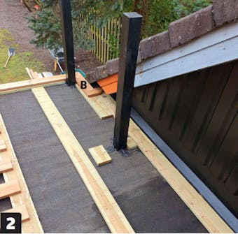 Langs kanterne af terrassen er det nødvendigt at lave “dobbeltunderlag” til det kantbræt (B), der skal afslutte terrassedækket hele vejen rundt.