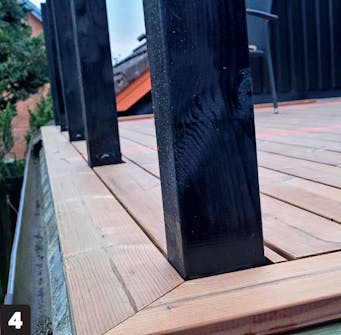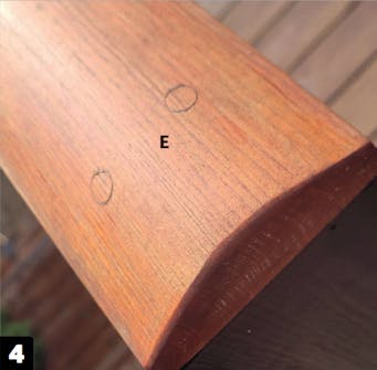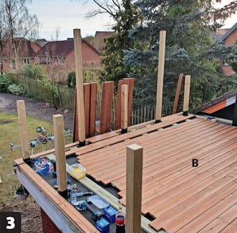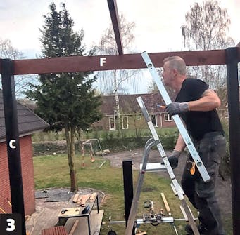 Den forreste rem (F) skal monteres på to af de stolper (C), der blev sat, inden terrassedækket blev lagt. Den skal sidde ca. 20 cm lavere end den bagerste og kan nemt fastgøres med franske skruer.