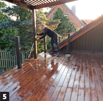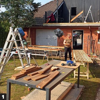Det trykimprægnerede fyrretræ olieres alt sammen inden opsætningen i samme farve som terrassebrædderne.
