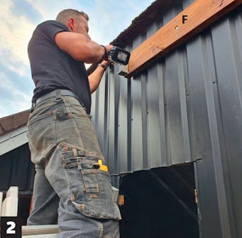 Overdækningens spær skal bæres af to remme (F). Den ene rem fastgøres direkte til facaden, og her er det vigtigt, at skruerne får fat i fast underlag og ikke kun facadepladen.