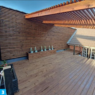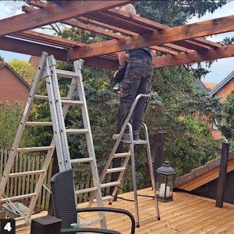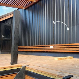 Her har vi valgt at bruge listebeklædning til pergolaens "tag". Foretrækker du et tag, der er helt lukket af, er der masser af muligheder.