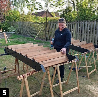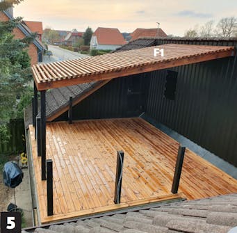 Formålet med overdækningen er, at den skal skærme for solen. “Taget” laves derfor af 45 x 45 mm reglar (G), som allesammen skæres af på længden på forhånd. Ligesom med terrassebrædderne (B) er olie inden montering en god idé. Især fordi reglarne er skåret af på længden, så endetræet også kan behandles.