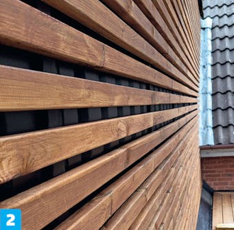Her er der ca. 2 cm mellem reglarne. De fastgøres fra siden med skjulte skruer, ligesom terrassebrædderne. Det er nemt, og du slipper for at bruge tid på at mærke op og bore for til hver eneste skrue.