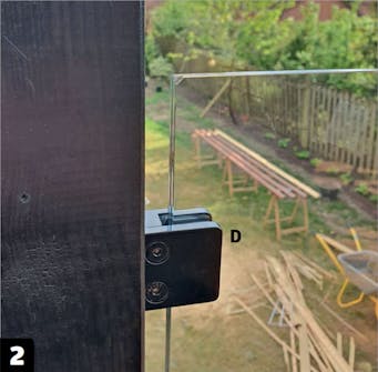 Glasværn (D) hører til i den dyrere ende, men er til gengæld hurtige at montere. To beslag på hver stolpe er nok. Glasset spændes fast mellem beslagets to dele, som er belagt med gummi indvendigt.