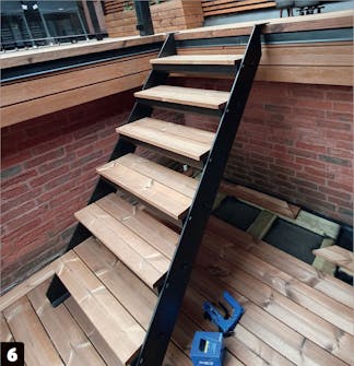 Opgangen til terrassen laves af to korte ligeløbstrapper, som deles af et repos. Her er vangerne fremstillet i stål, som er lakeret sort. Trinnene skrues fast til et vinkeljern, der er boltet fast på indersiden af vangerne.