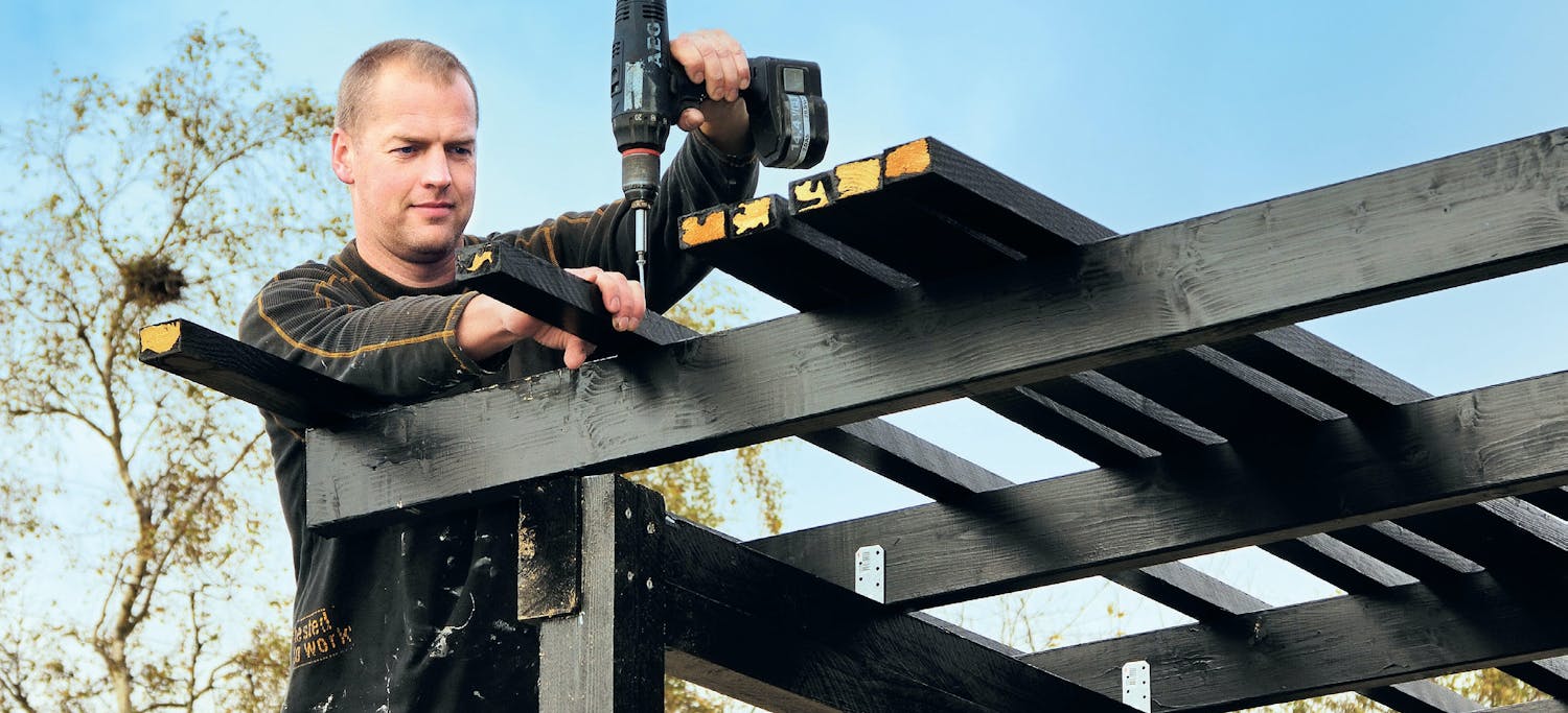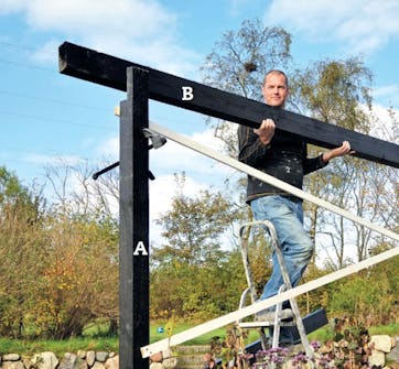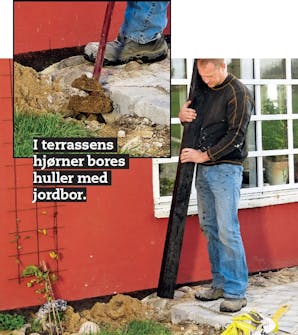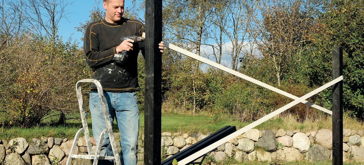 I projektet her graver vi stolperne ned. Det giver en god stabilitet. Vi fastgør også spærene til husets facade.