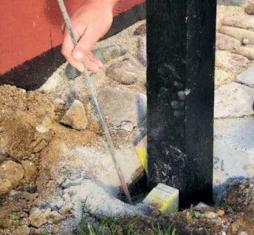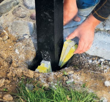 Kontroller, at stolpen er i lod, og fikser stolpens placering med kiler. TIPS: Du kan også fiksere stolpen med lange lister, der slås skråt ned i jorden. Så er det nemmere at fylde beton i hullet.