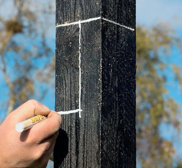 Stolpens endelige højde og højden på remmen markeres. Marker også et snit halvvejs ind på stolpen og med samme højde som remmen - her 150 mm. Den ene rem placeres højere for at give fald - gerne på 10-12 cm pr. meter.