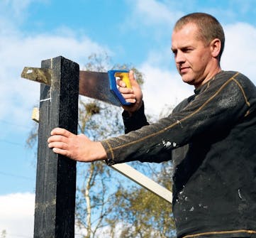 Stolperne er i jorden, og efter et par dage er betonen hærdet. Nu skal stolperne saves til i højden, og der skal skæres et 150 mm højt hak til remmene, så de har noget at hvile på.