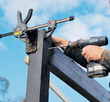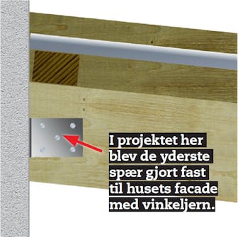 Oven på remmene monterer vi seks spær med 70 centimeters afstand, og vi har valgt en lidt kraftig dimension (47 x 125 mm) af hensyn til snemængderne om vinteren. Spærene monteres på remmene med vinkel beslag.