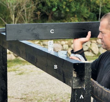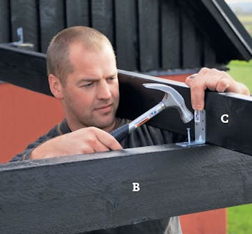 Spærenes (C) placering på remmen (B) mærkes op. Vinkelbeslaget på den ene side monteres - med 100 mm galvaniserede søm eller 5 x 90 mm skruer.