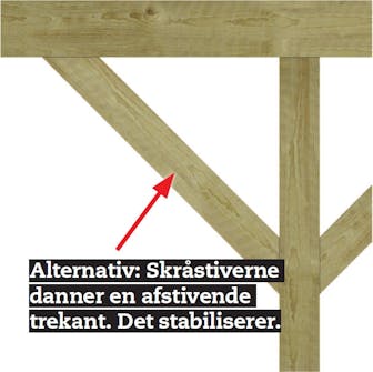Hvis du ikke graver stolperne ned, er du nødt til at kompensere med nogle afstivende trekanter. I en åben stolpekonstruktion sætter man typisk skråstivere i toppen af stolperne. Der skal sættes skråstivere på mindst to sider af en firkantet konstruktion. Så kan byggeriet modstå vindtryk fra alle sider.