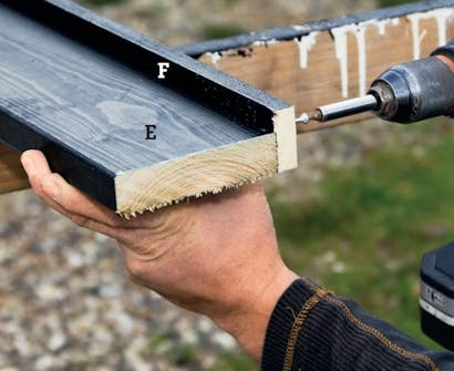 Sternbrættet (E) i siderne saves til på længde. I toppen af sternbrættet skrues en liste (F) på med 5 x 50 mm skruer.