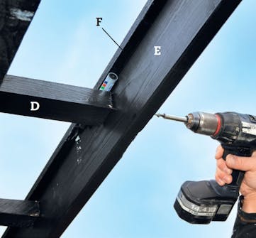 Sternbrættet skrues fast på lægterne (D) med 5 x 90 mm skruer. Brug en afstandsklods (her bruger vi en tusch) til at sikre, at der er 2 cm luft mellem lægte (D) og liste (F) på sternbrættet.
