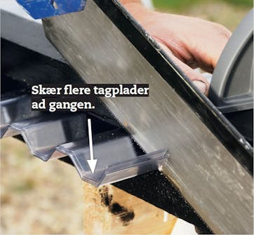 Trapezpladerne skæres til med en fintandet fukssvans. TIPS: Det er nemmest at save, hvis du saver flere plader samtidig og lægger en liste oven på pladerne tæt på skærestedet.