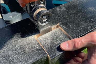Med en multicutter kan vi lave det vandrette snit i remmen og fjerne klodsen, så vi ender med at have vores hak.