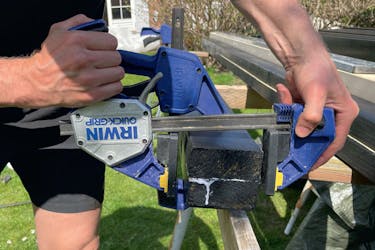 Inden vi skruer, retter vi hvert enkelt spær op, så det sidder vinkelret på remmen. En stor tvinge giver os mulighed for at vride spæret på plads.