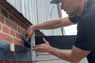 Vi måler op til hver enkelt plade for sig; vores mur buer en smule, så nogle plader skal være lidt længere end andre, hvis kanterne for enden skal flugte.