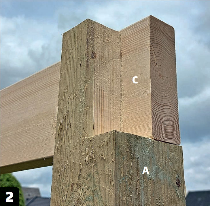 Der saves hak i stolperne (A og B) i toppen. I hjørnestolperne skal der saves to hak med sav og multicutter, så både de yderste spær (D) og remmene (C) kommer til at flugte med ydersiden af stolperne.