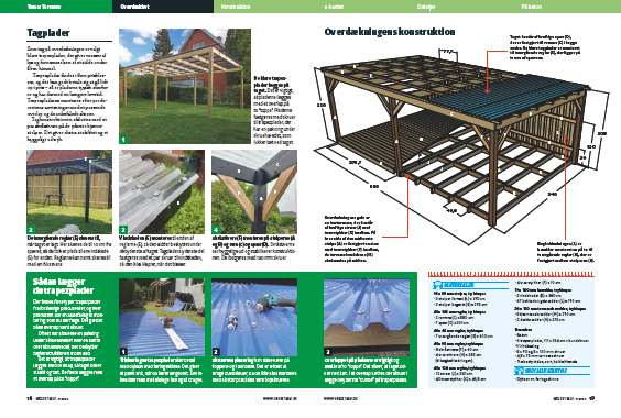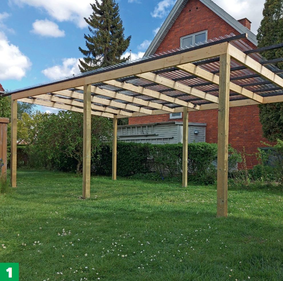 Overdækningen måler 360 x 600 cm, når taget kommer på. Stolperne skal placeres 10 cm indenfor, så taget kommer til at rage lidt ud over stolperne.