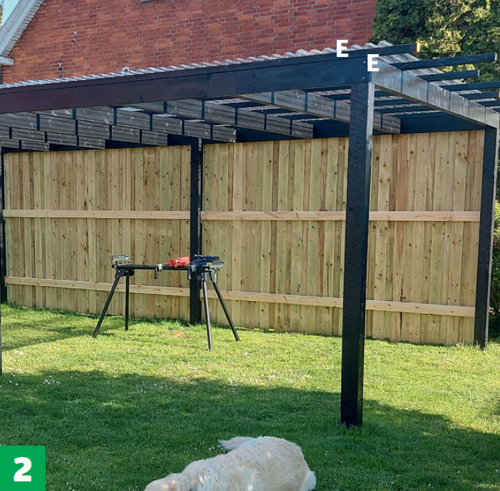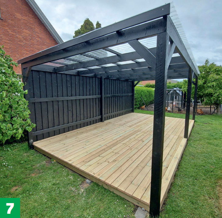 I toppen af stolperne laves hak til rem og spær, så de flugter med ydersiden af stolperne. Det ser både pænt ud og giver en stærk konstruktion. De forreste stolper er 220 cm høje, de bagerste 205 cm, så taget får fald.