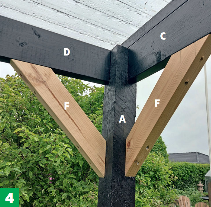 Montér remmene (C) og det yderste spær (D). Spærene skal skæres til med skrå snit, så de passer mellem remmene. Spærene fastgøres med 120 mm skruer til remmene. Yderste spær fastgøres også til stolperne.