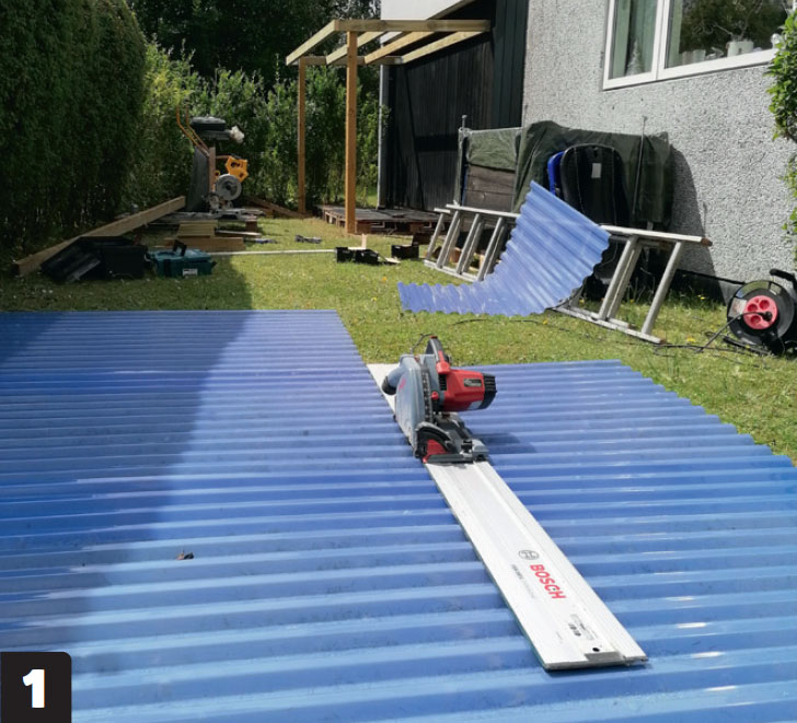 Tilskæring af trapezplader sker bedst med dyksav med føringsskinne. Det giver et pænt snit, når du kører langsomt. En vinkelsliber med metalklinge kan også bruges.