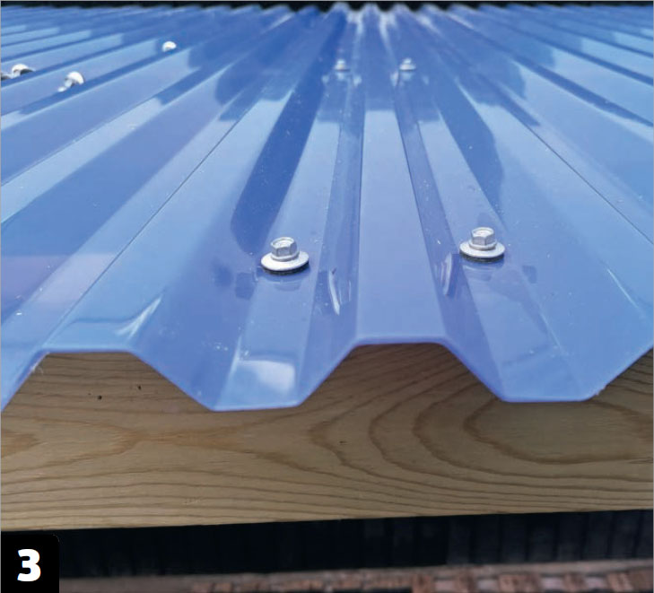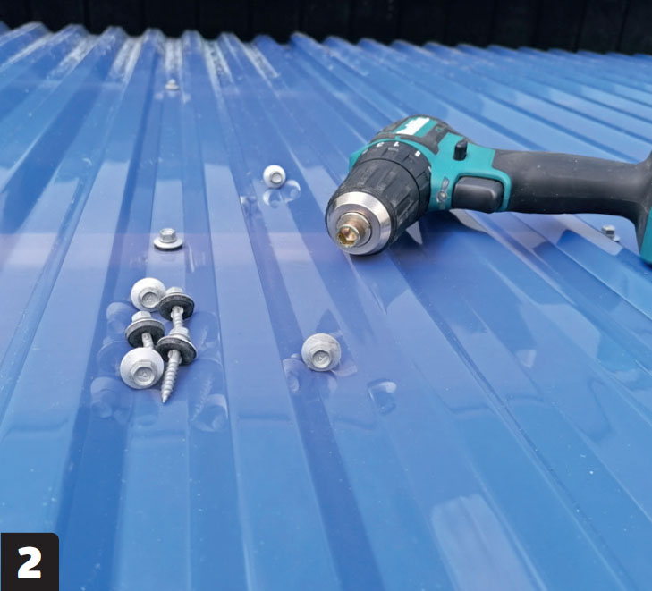 De klare trapezplader lægges på taget. Det er vigtigt, at pladerne lægges med et overlap på to “toppe”. Pladerne fastgøres med skruer til trapezplader, der har en pakning under skruehovedet, som lukker tæt ved taget.