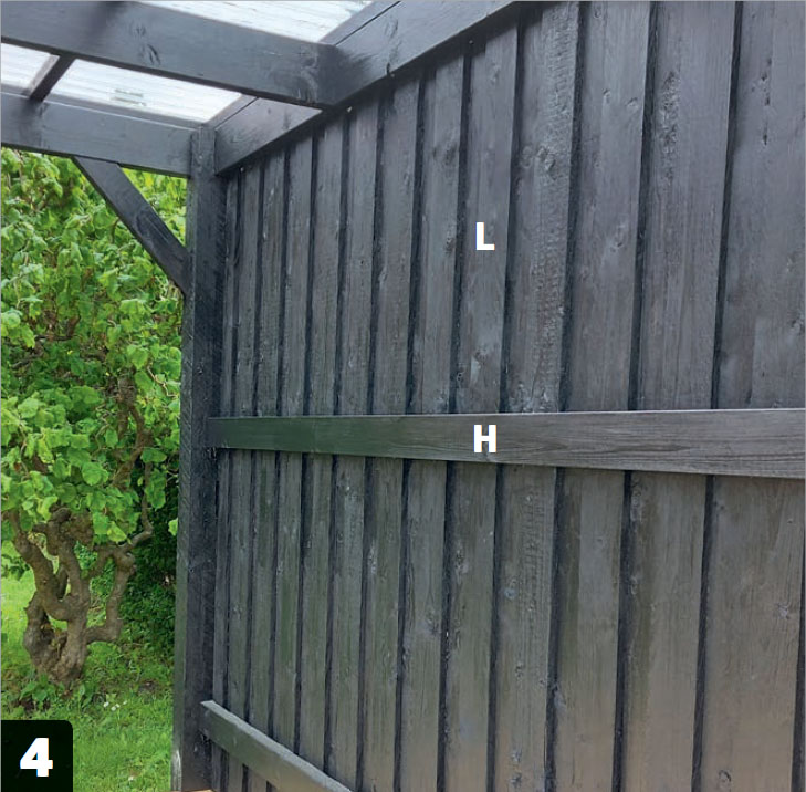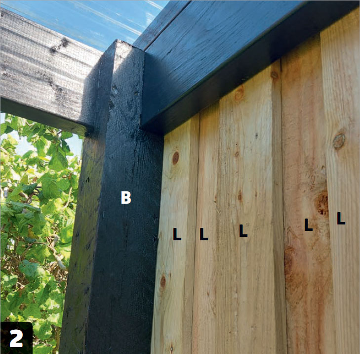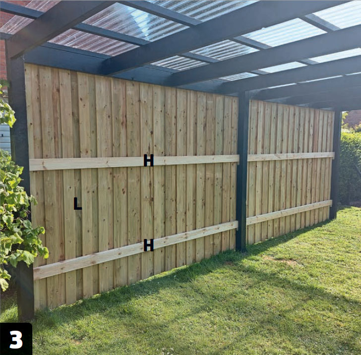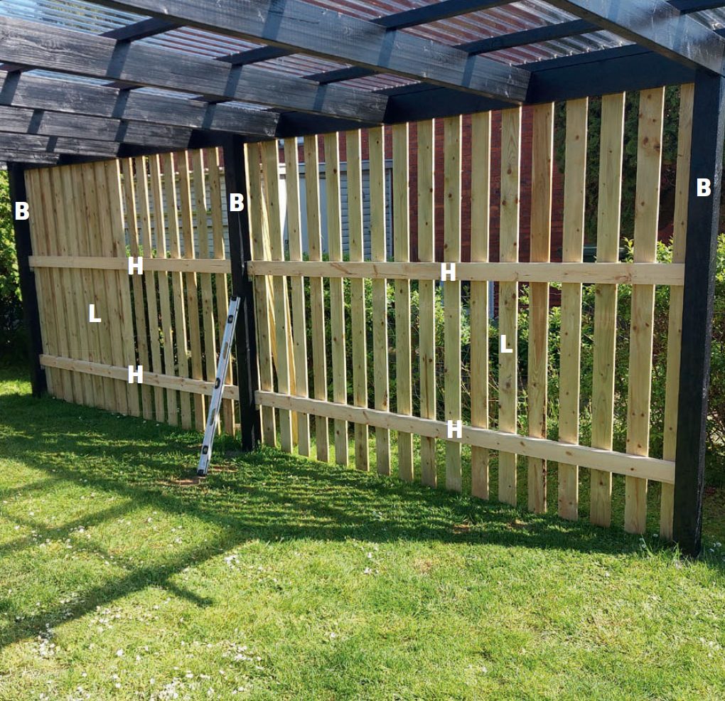 Montér først fire tværstivere (H), så du har noget at skrue de lodrette beklædningsbrædder (L) fast til. De tværgående reglar fastgøres med vinkelbeslag og skruer til stolperne (B). Det inderste “lag” beklædningsbrædder fastgøres med en afstand på 6 cm.