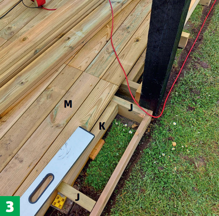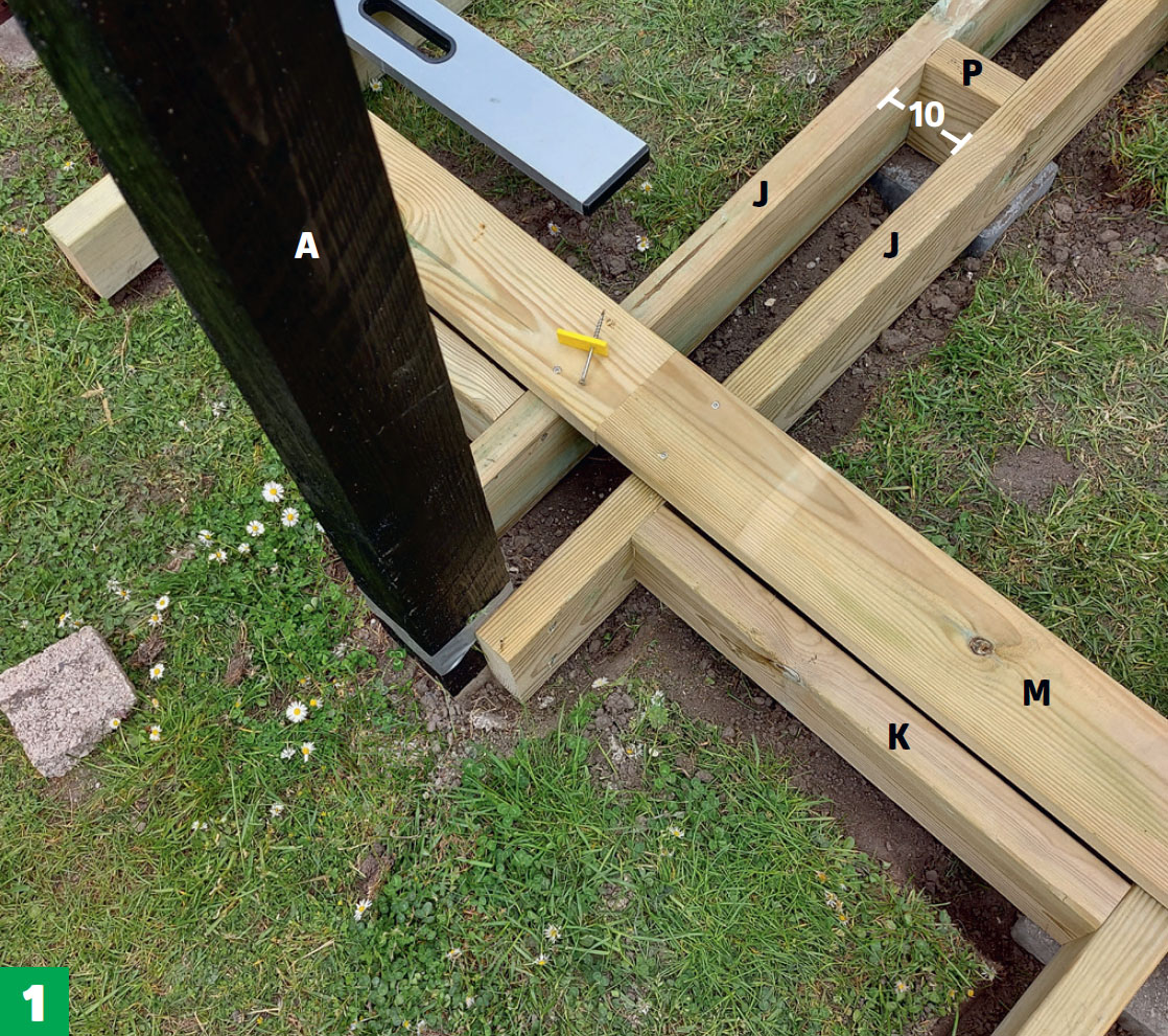 Byg den bærende konstruktion til træterrassen. De steder, hvor strøerne (J) rammer stolperne (A og B), bliver de skruet fast med 120 mm skruer. Bor for til skruerne, så strøerne ikke flækker. Ved den midterste stolpe (A) fastgøres en strø på hver side, da terrassebrædderne (M) skal samles her. Der sættes små tværstykker (P) imellem.