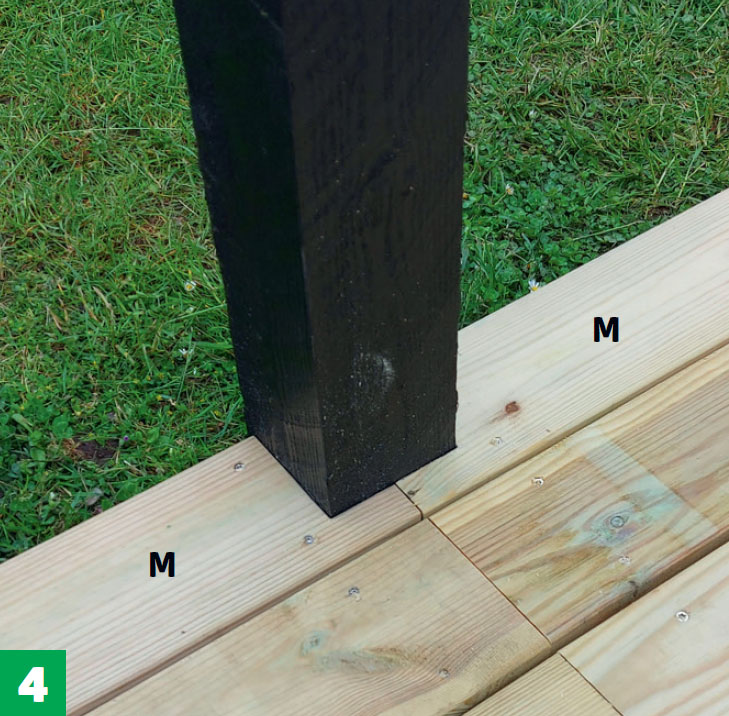 Der er savet hak i de yderste brædder (M), så afslutningen ved stolpen bliver fin. Der skal være et par mm luft til stolpen. Terrassebrædderne fastgøres med 4,8 x 75 mm syrefaste terrasseskruer.