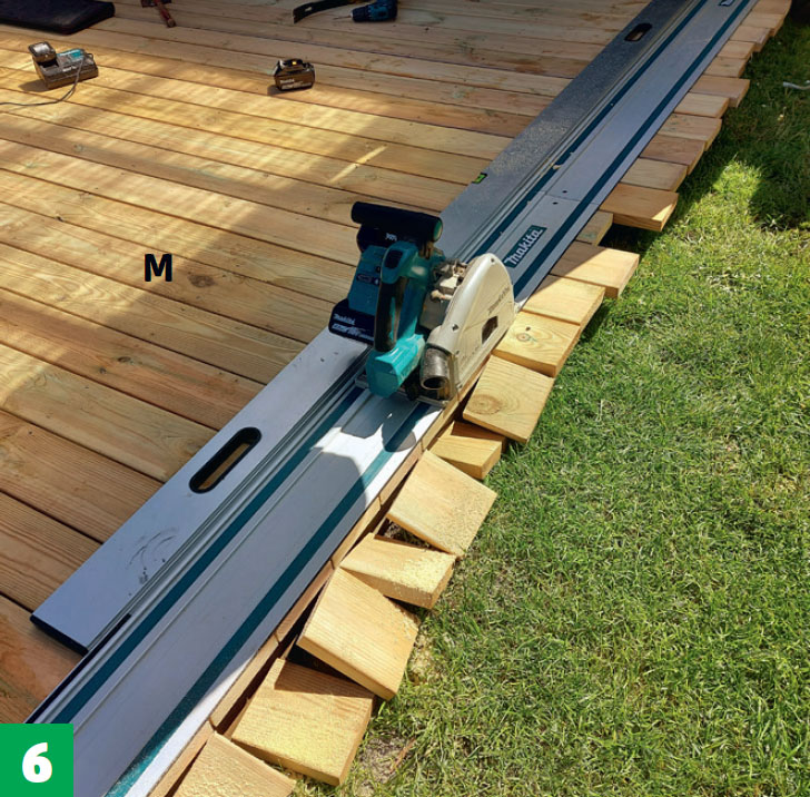 Skær terrassebrædderne (M) til i enderne, så terrassen flugter med ydersiden af stolperne. Det er lettest at gøre på én gang til sidst frem for at skære hvert enkelt bræt - og let med en dyksav med føringsskinne.
