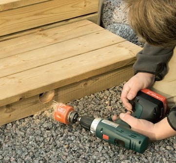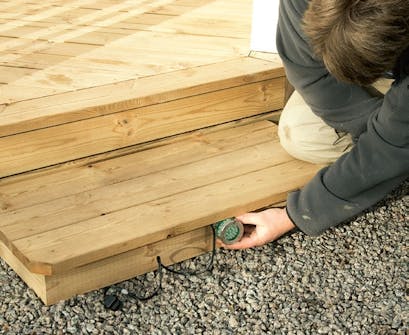 Træk elektrikerrør gennem alle terrassebjælkerne i huller, du har boret forinden. Lav et par cm’s afstand mellem rørene ud for hver lampe. TIPS: Bor 18 mm huller - så er rørene lettere at få igennem bjælkerne.