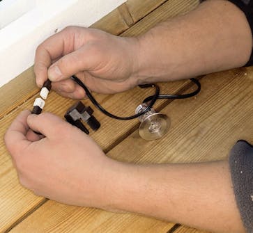Vent med at montere brædderne. Når alle lamper er på plads og forbundet, er du klar til at skrue terrassebrædderne på igen. Men afprøv lyset først. TIPS: Hvis en lampe ikke lyser, skal du tjekke, at stifterne i klemskruen ikke er bøjede.
