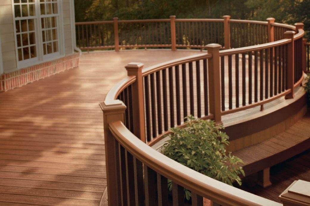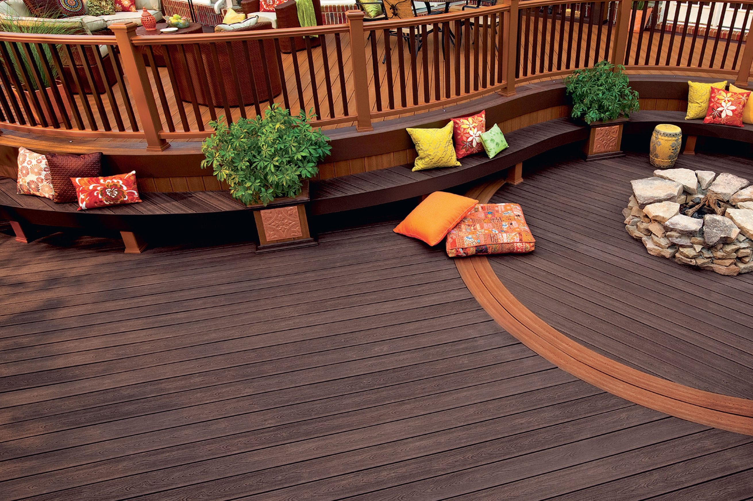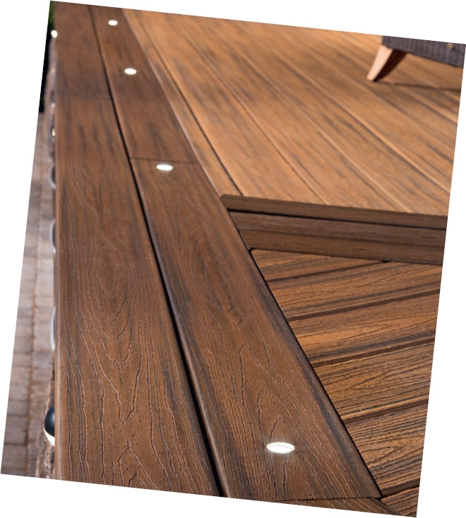 Du kan komme langt væk fra de rette vinkler og lige sider ved blot at lægge dækket som normalt og skære enden af brædderne til, så de danner vinkler eller buer. Det er helt enkelt, fordi understøtningen ikke behøver følge kanten slavisk, og fordi du kan benytte teknikken med at montere for lange brædder og derefter skære dem til i et langt, samlet snit, hvor du fører din rundsav eller stiksav langs en lige eller kurvet skabelon.