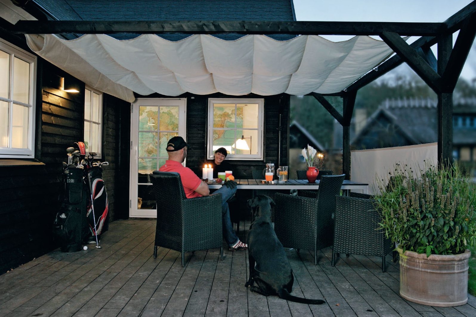En pergola omspundet af klatreplanter, et sejl der trækkes ud ved lejlighed eller et fast halvtag - alle slags overdækning kan give dig flere timer på terrassen, fordi de skygger for solen i middagsheden, dækker for regnen og holder på varmen, når solen er gået ned. Her ser du en sejldug, der er hængt op i wirer over terrassen - lige til at trække for eller fra, som du har brug for det.