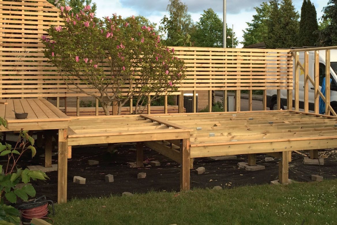 Det kan være oplagt at følge et skrånende terræn, men du kan også bruge flere niveauer til at skabe spænding, hvor terrænet er fladt som en pandekage. Og så kan opdelingen redde dig fra at lægge brædder i forlængelse af hinanden, det forenkler faktisk arbejdet.