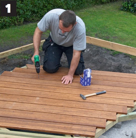 Strøerne lægges på det første lag. De skal ikke se kønne ud, men de skal sikre støtte under brædderne for hver 60 cm og tæt under alle bræddeender, og de skal gøre det muligt at sætte skruerne i pæne mønstre.