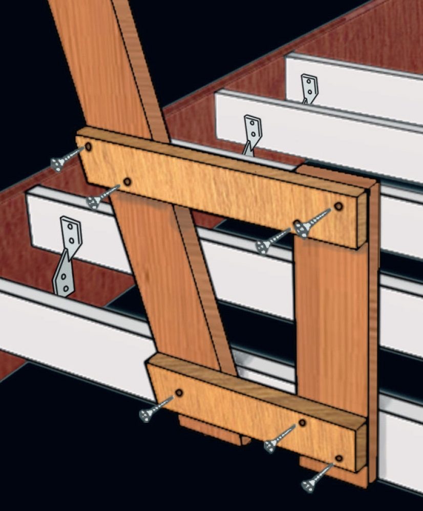 Trappen kan ofte opbygges enkelt. Her skruer vi først strøerne under nederste trin på et lag bjælker.