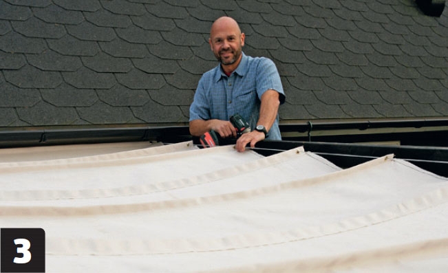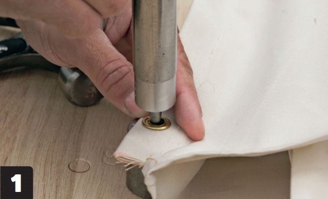 Sejlet skæres, sys og forsynes med øjer. Vi vil hænge et rektangulært tag af stof ud over en række parallelle wirer, så det nemt kan trækkes for og fra efter behov.