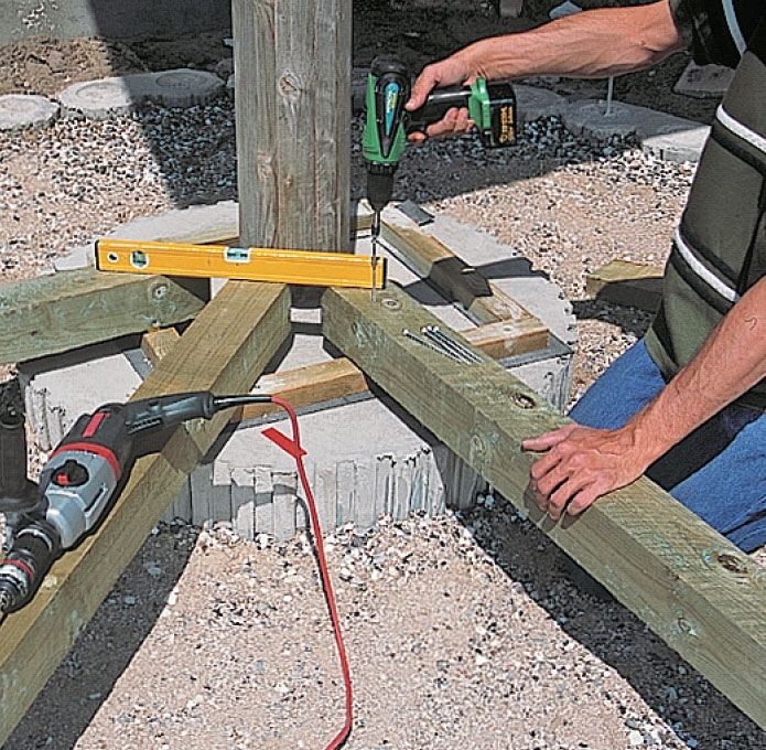 Under træterrassen er det næsten altid lettest at bygge et skelet i to lag. Det første lag klodses eller skrues op, så det ligger i samme plan - så skal du ikke bekymre dig om det, når de langt flere strøer lægges op.