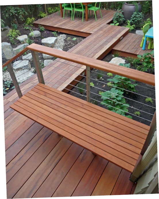 Når du bygger terrassen i flere niveauer, er det er oplagt at lukke hullet mellem de forskellige dæk af med terrassebrædder af samme slags som på dækket. Derfor er det smart at arbejde med højdeforskelle, der går op med et eller flere brædder plus den nødvendige luft. Et enkelt eller to brædders forskel i niveau giver en stor effekt - og vil du have større forskel, skal du måske tilføje både trapper og rækværk.