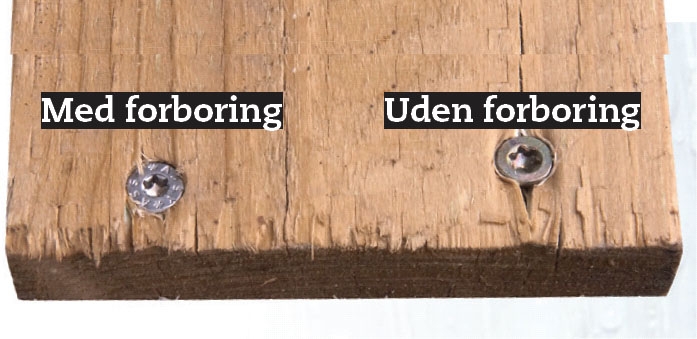 Vælger du synlige skruer, skal du tage dig tid til at bore for og til at lave undersænkning til hovedet. Derved undgår du, at skruerne flår træets fibre i stykker og skaber revner, så træet suger vand som en svamp. Hullet skal være så stort, at skruen slutter tæt i siderne.
