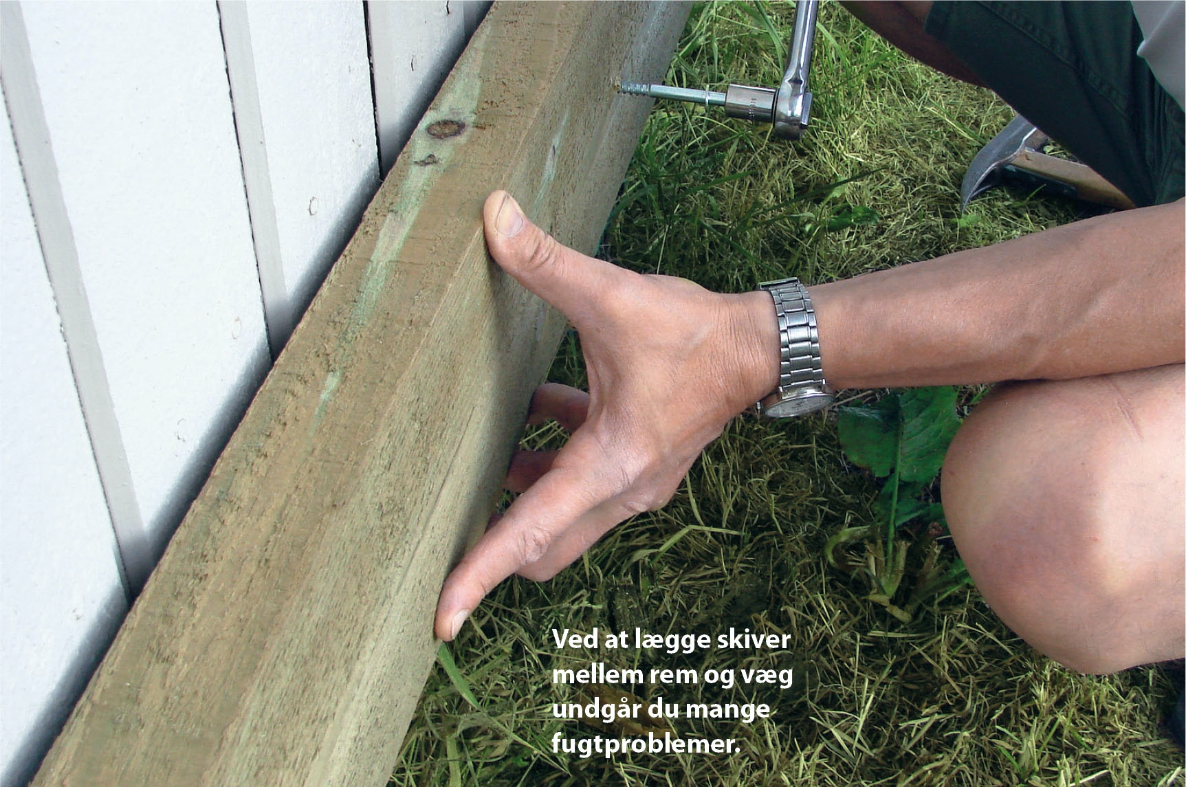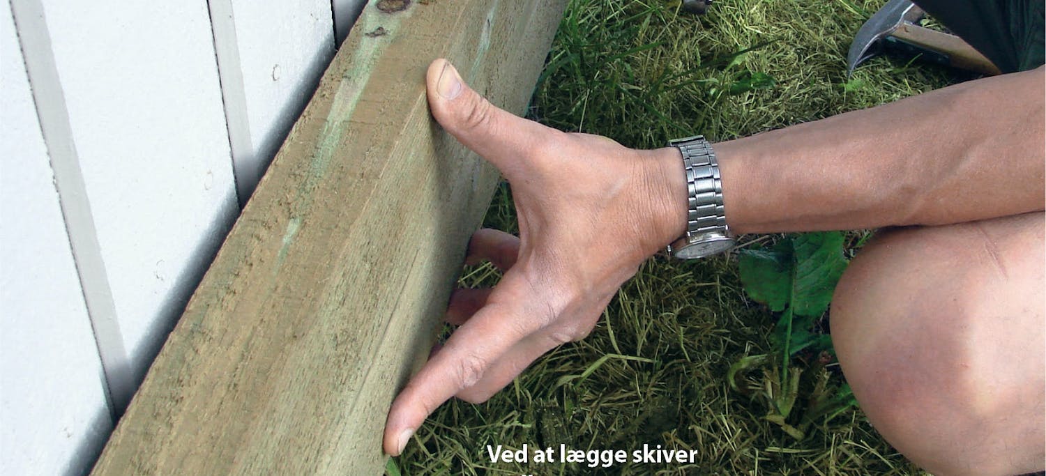 Ofte er en eller flere sider af træterrassen båret af mur, væg eller sokkel på en tilstødende bygning. For at undgå, at der samles fugt i samlingen, skal du rykke remmen lidt ud fra underlaget, når den monteres. Det kan du fx gøre med et par kraftige skiver eller 4-6 lag murpap lige bag de skruer, som skal holde remmen fast.
