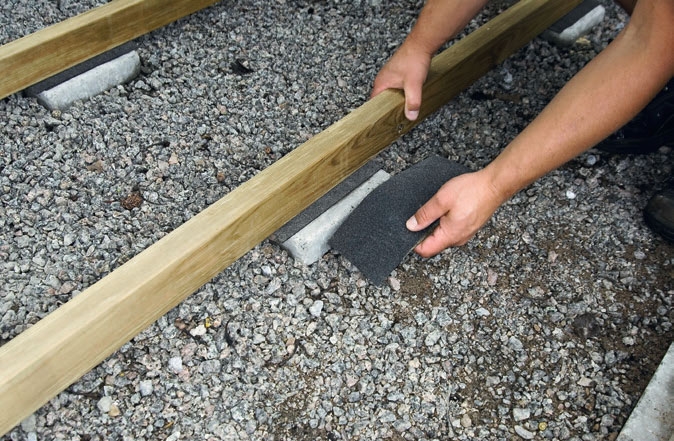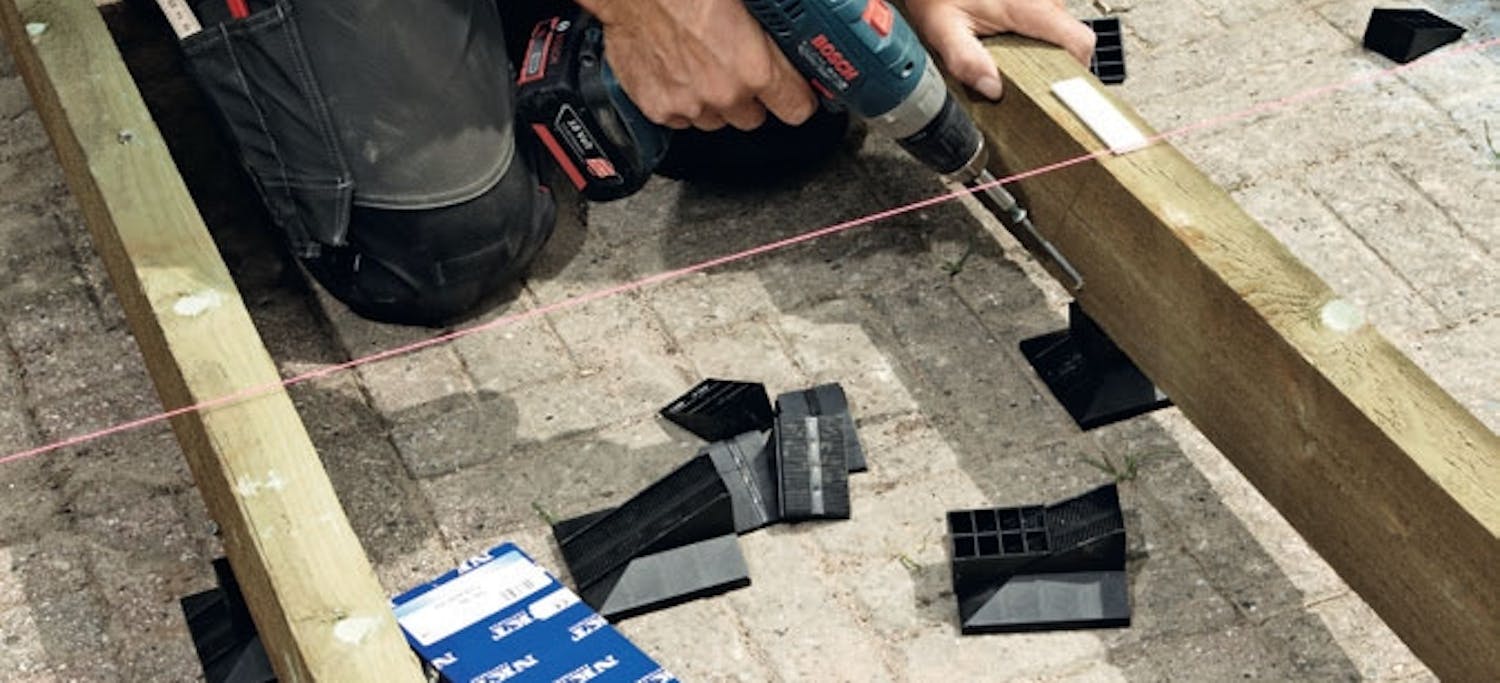 Når du vil lægge en træterrasse oven på en gammel stenterrasse eller bruger fliser som punktunderstøtning, kan du købe nogle smarte plastfødder til at lægge bjælkerne på.