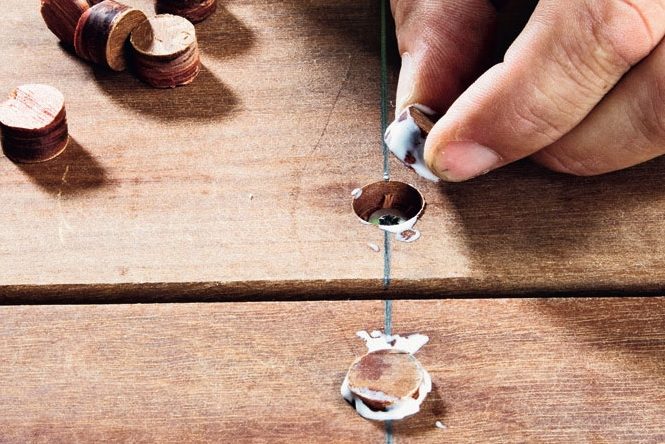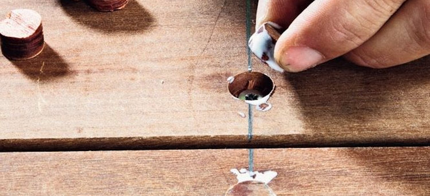 Det er et stort arbejde. Men har du ofret en god kvalitet terrassebrædder, kan det godt betale sig at investere tid i at gemme alle skruer under propper, som du skærer ud af træ. Det ser ikke bare godt ud. De limede propper bevarer også terrassen, fordi de gør overfladen tæt og hindrer vand og fugt i at trænge ned omkring skruerne.