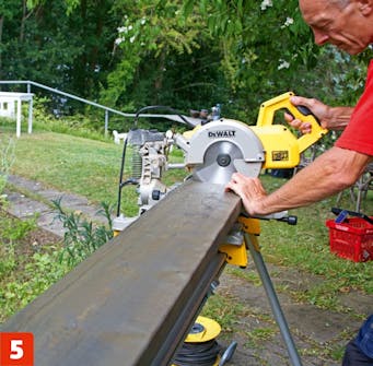Skær terrasseplankerne (B) til. Langt de fleste af plankerne skal have samme længde, så de kan skæres til på forhånd. Har du ikke en kap-/geringssav, så lån eller lej en.